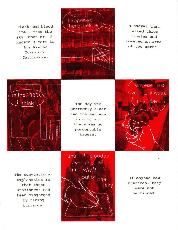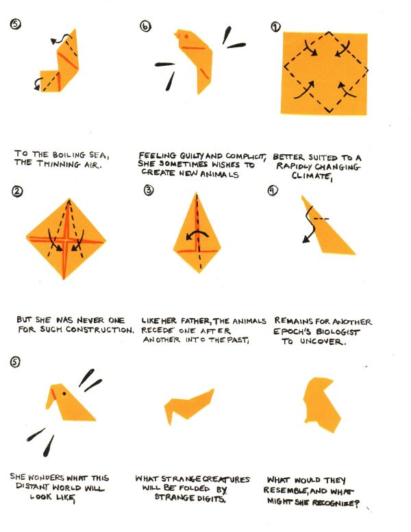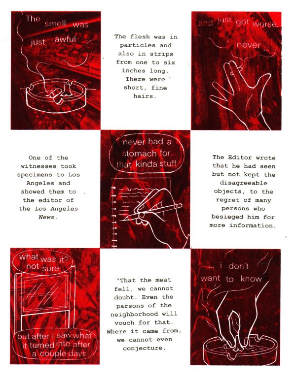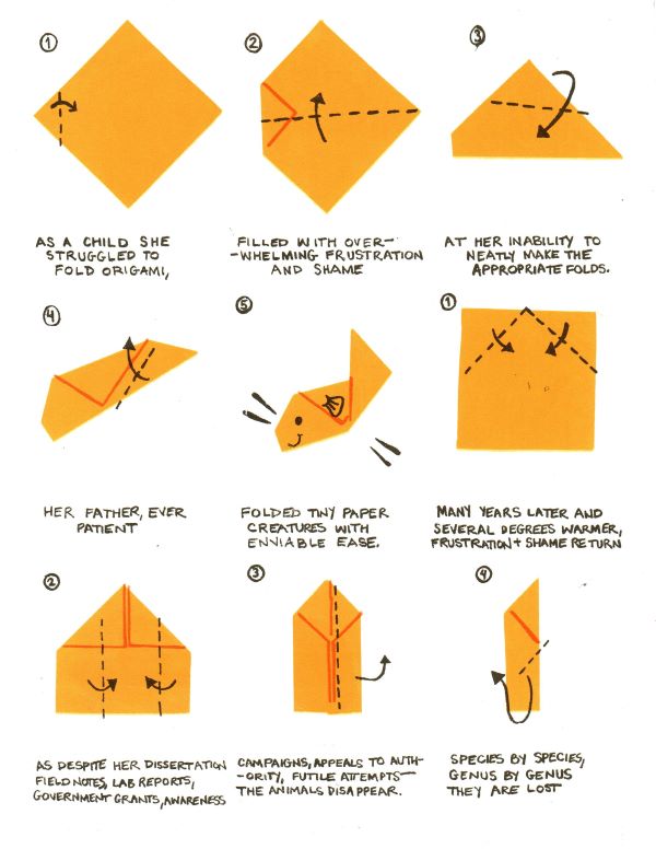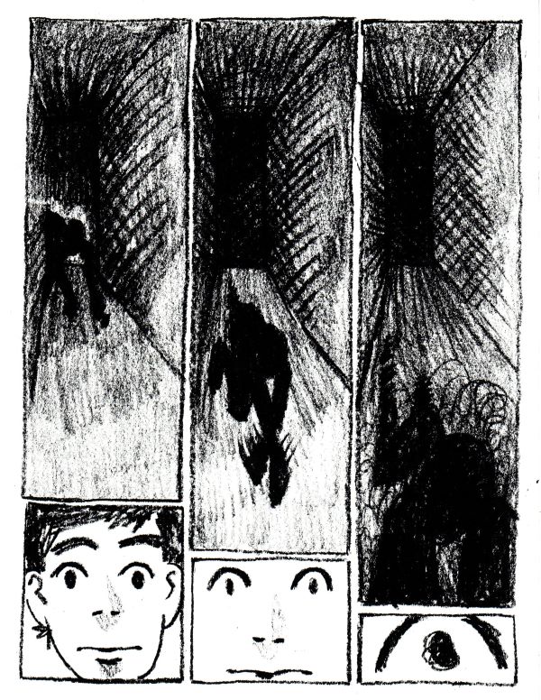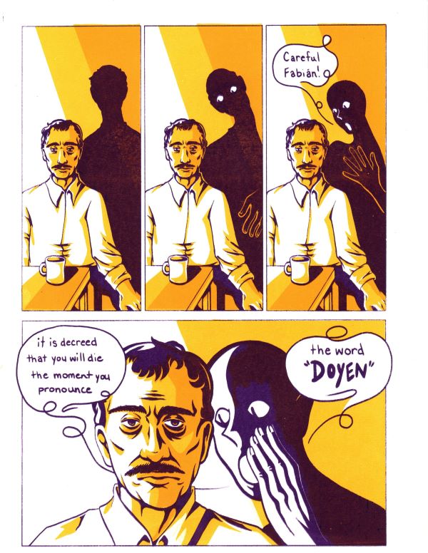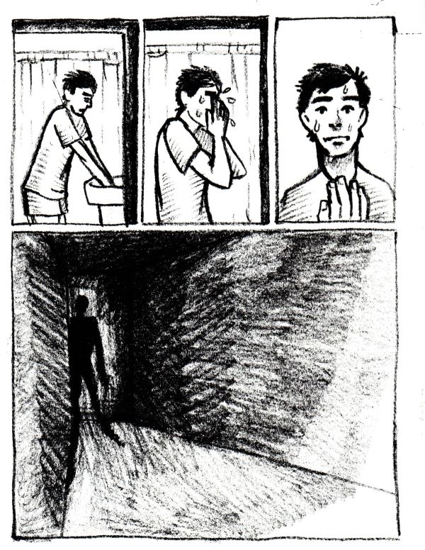 Four Short Comics is a collection of exactly what you might expect. Each story was adapted from a different source with the goal of crafting a compelling story in as little space and time as possible. Included is "Taboo" based on the short story of the same name by Enrique Anderson-Imbert, "Animals" based on the instructions from a pack of origami paper, "Showers" based on an excerpt from Charles Fort's Lo!, and "Corridor,"based on a nightmare.